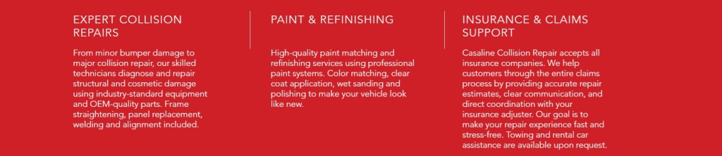Step into Casaline Collision Repair and experience professional collision services focused on safety, quality and customer care. Book a free damage inspection and estimate — we’ll walk you through repairs, timelines and insurance steps.